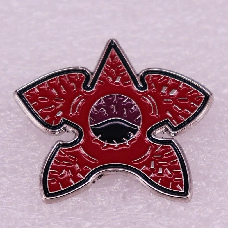 Este pin de esmalte está inspirado en el aterrador pero icónico Demogorgon de Stranger Things. Su diseño detallado en tonos rojos y negros captura la forma de su temida flor carnívora, perfecta para fans de la serie y amantes del terror retro.